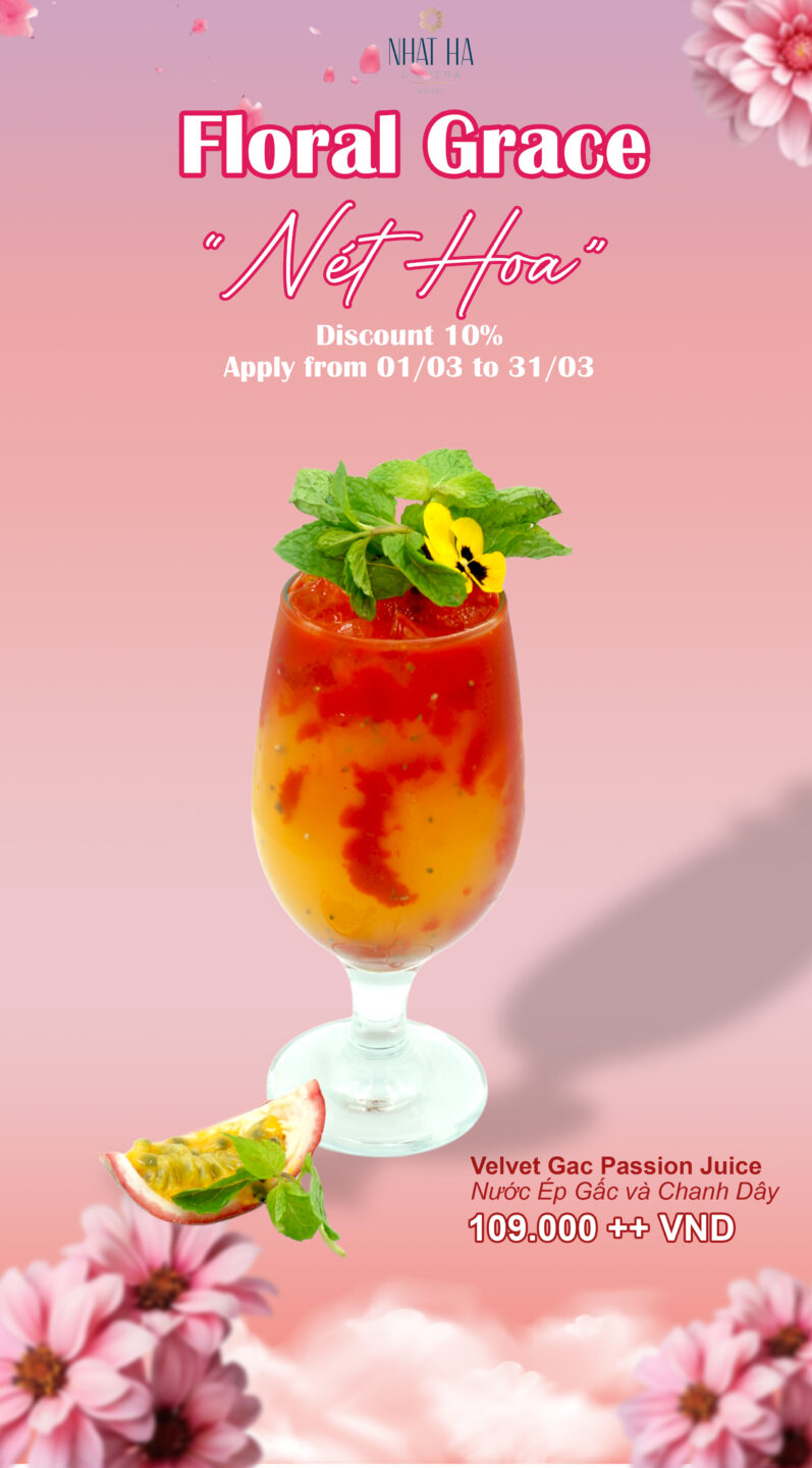 Velvet Gac Passion Juice opens the Floral Grace journey with a mesmerizing orange-red hue, symbolizing vitality and feminine radiance. Crafted from gac fruit and fresh passion fruit, this refreshing beverage offers a delicate balance between natural sweetness and vibrant acidity. The smooth texture gently coats the palate, while the tropical fragrance lingers lightly, creating a graceful yet invigorating sensation.